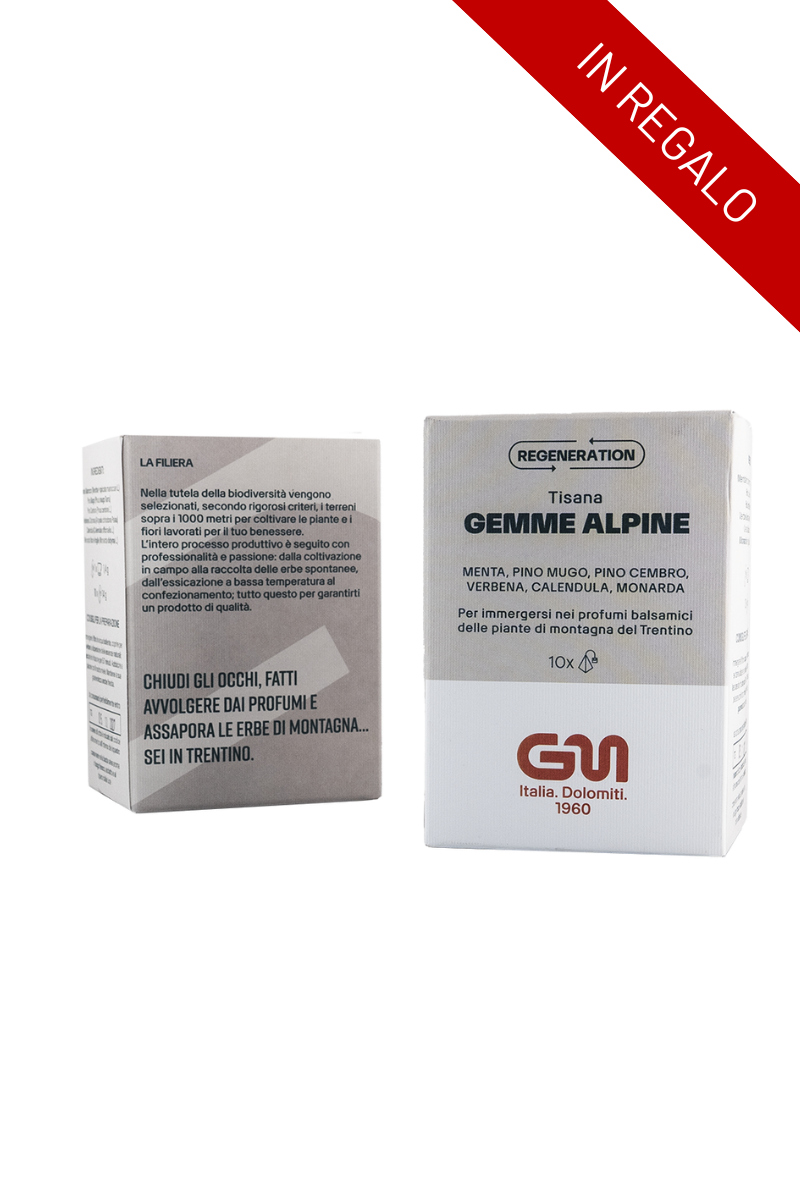 Nel bundle trovi anche un regalo: una tisana “Gemme Alpine”, dal gusto fresco e balsamico, ispirata ai profumi del sottobosco.