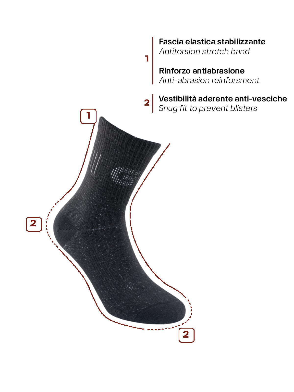 - Anti-vesciche: fascia elastica stabilizzante e cuciture piatte evitano lo sfregamento nei punti sensibili.
